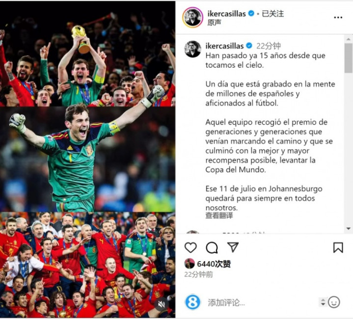 直播吧7月11日讯西班牙传奇门将卡西更新社媒动态,回顾15年前的今天赢得世界杯冠军